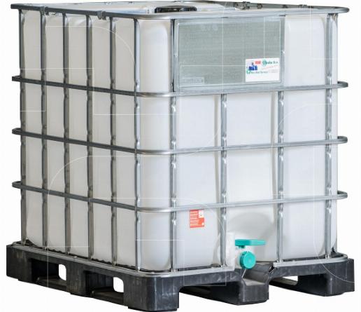 Watertank container met kunststof pallet voor opslag en vervoer van verschillende vloeistoffen.
