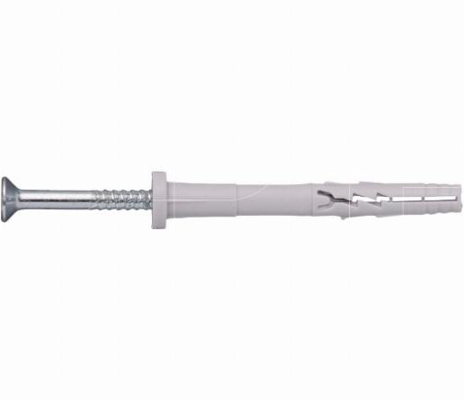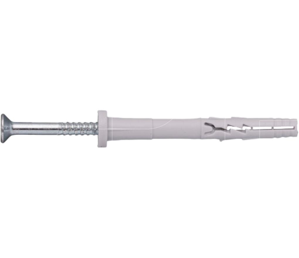Slagplug met voorgemonteerde schroef en vlakke kraag, voor o.a. bevestigen van metaalconstructies in alle bouwmaterialen. De plug is vervaardigd van kwalitatief hoogwaardig (virgin) nylon, de schroefnagel van gegalvaniseerd staal. Bij het inslaan van de nagelplug spreidt de nylon plug open en verankert zich in de ondergrond.