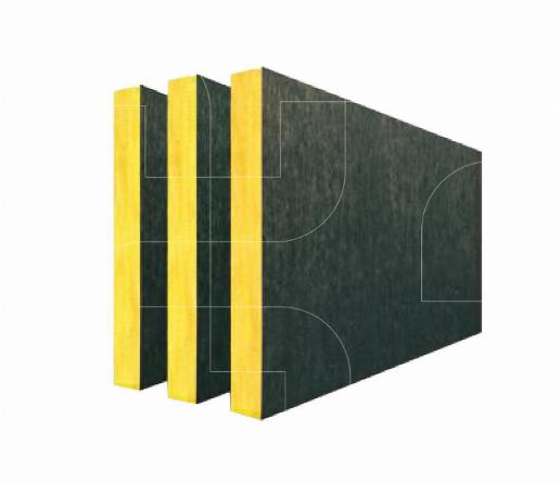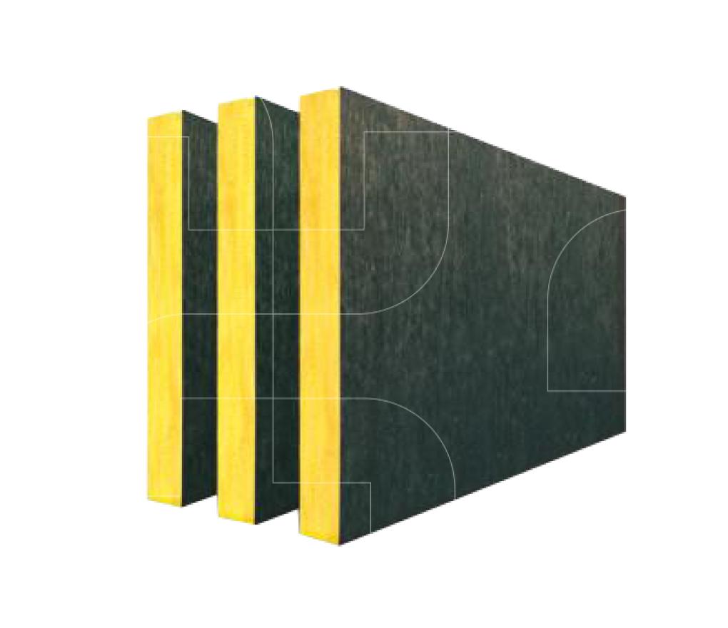 Langs één zijde bekleed met een zwart, weerbestendig glasvlies en langs andere kant bekleed met een geel vetrotex-glasvlies.