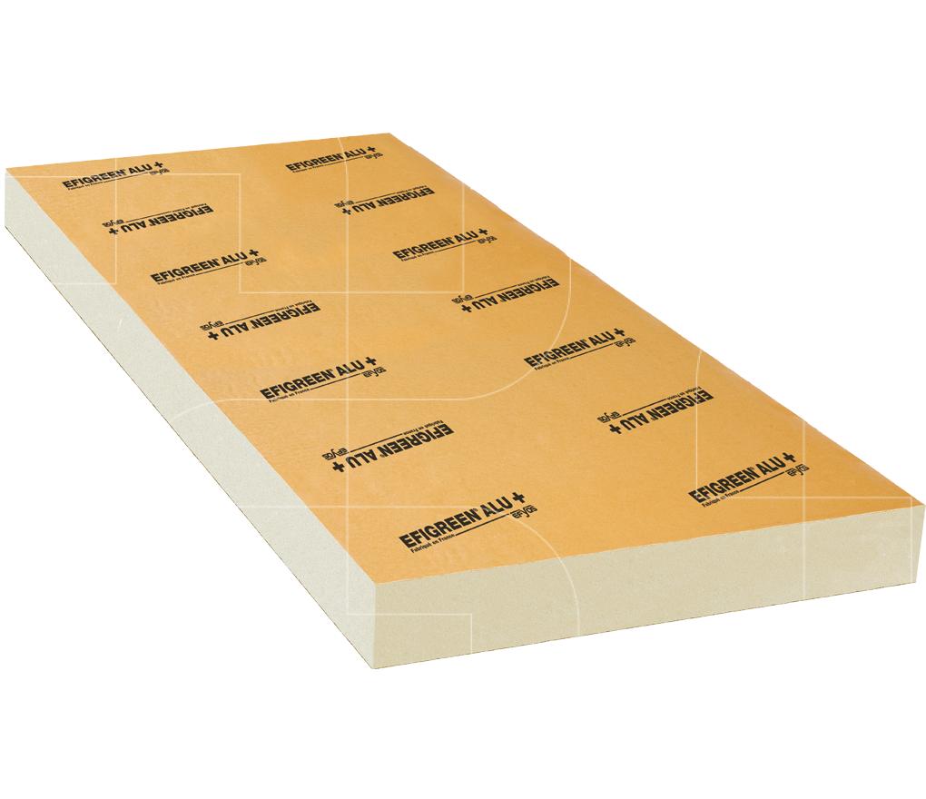EFIGREEN ALU+ is een thermische isolatieplaat bestaande uit een polyisocyanuraat (PIR) hardschuim. De plaat is aan beide zijden voorzien van een meerlaagse bekleding op basis van gealuminiseerde film, bedekt met kraft en afgeschermd met polyetheen. EFIGREEN ALU+ wordt hoofdzakelijk gebruikt als thermische isolatie van platte daken.