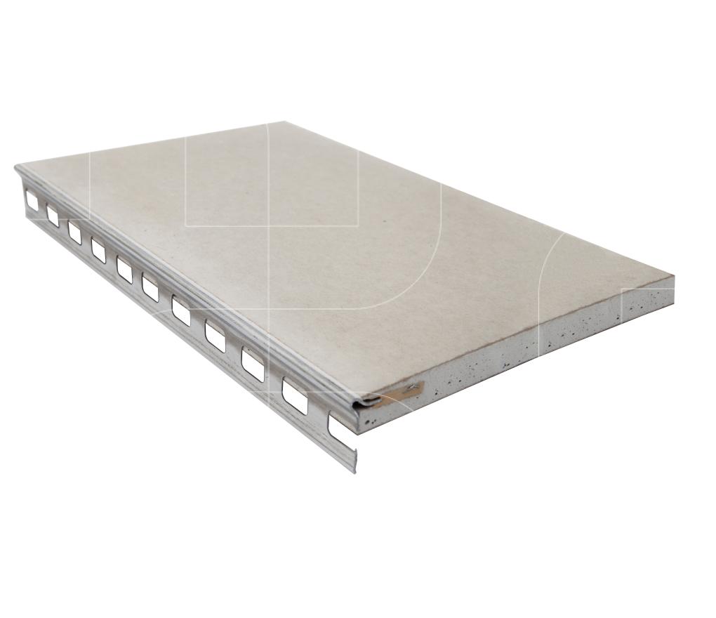 - Het dagkantelement DK-1 bestaat uit een op breedte gezaagde gipskartonplaat, waarbij in één lengtezijde een pleisterprofiel is ingewerkt.