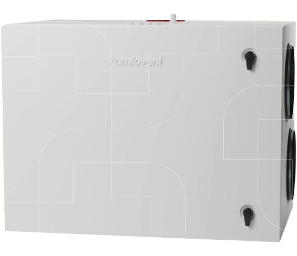 Compacte ventilatie-unit met zijaansluitingen in industriële bouwkwaliteit en voorzien van een warmtewiel.
