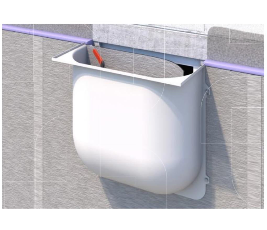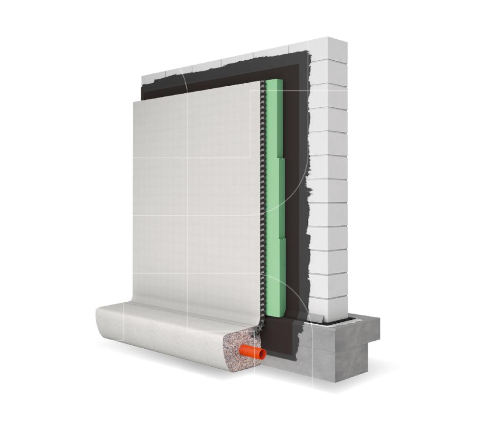 De folie kan verticaal worden toegepast ter bescherming en drainage van de perimeterisolatie en waterdichtingslaag van de kelderwand.