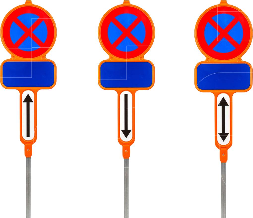 Verkeersbord E3 - verboden stil te staan en parkeren op statief en blauw onderbord.