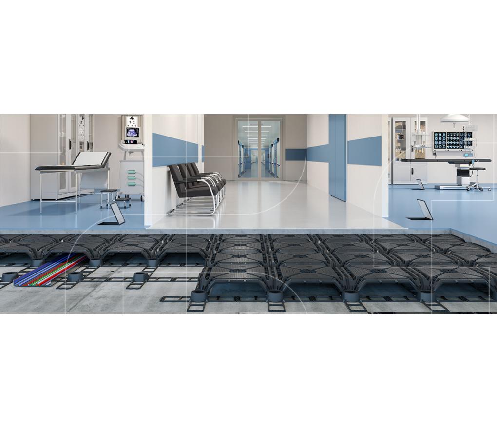 - Maakt een snelle en intuïtieve installatie mogelijk . De basismodules creëren een orthogonaal raster dat de positionering van MEP met grote precisie en flexibiliteit ondersteunt. Beton wordt vervolgens over de bovenste bekisting gegoten, waardoor een monolithische beloopbare basis ontstaat