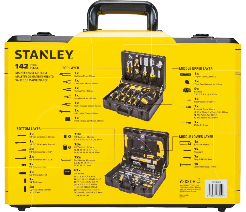 De Stanley complete en georganiseerde gereedschapsset, met een stevige aluminium behuizing, metalen scharnieren en versterkte hoeken biedt deze koffer maximale bescherming en duurzaamheid.