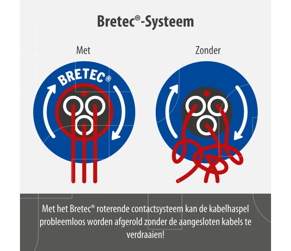 - Dankzij het Bretec® roterende contactsysteem kan de kabeltrommel worden opgerold of afgerold zonder dat aangesloten kabels verdraaien