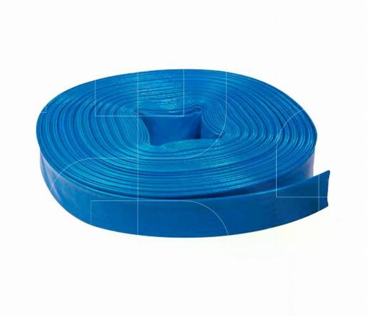 Plat afrolbare afvoerslang 1" en geplastificeerde PVC slang verstevigd met polyesterdraad met een lengte van 25 meter.