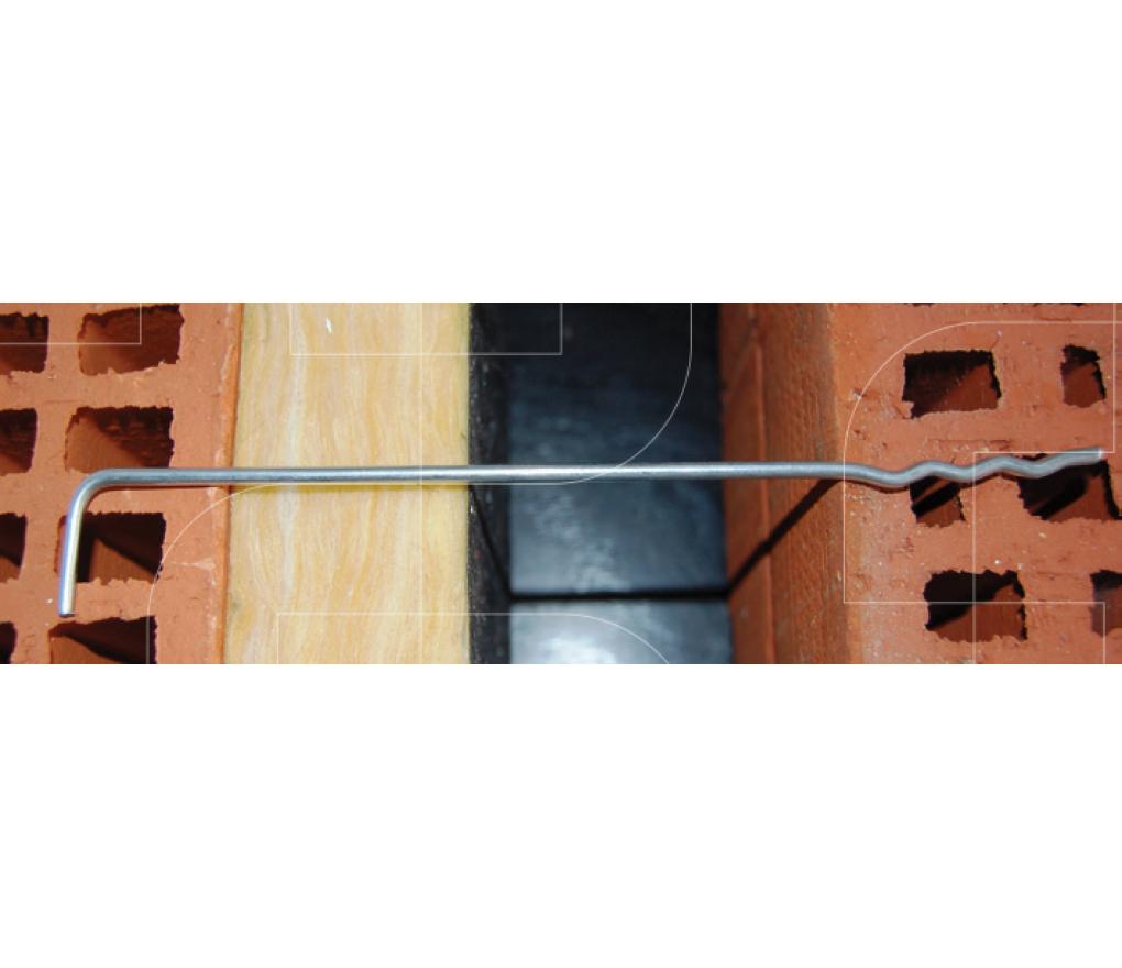 Muurhaak om in te metselen met gegolfd uiteinde zodat de isolatie makkelijker over het spouwanker kan worden geprikt.