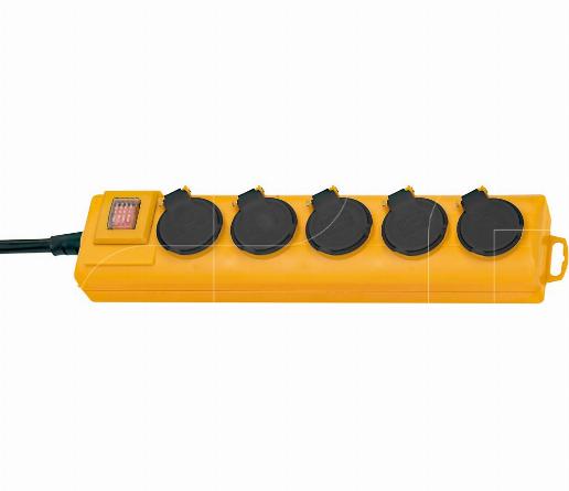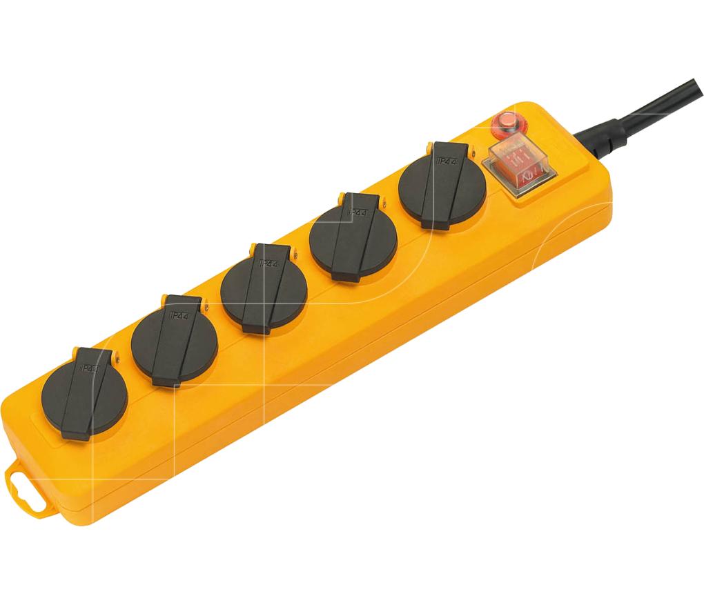 Verdeelblok IP54 met 5 spatwaterdichte stopcontacten voor universeel gebruik buiten en op bouwplaatsen.