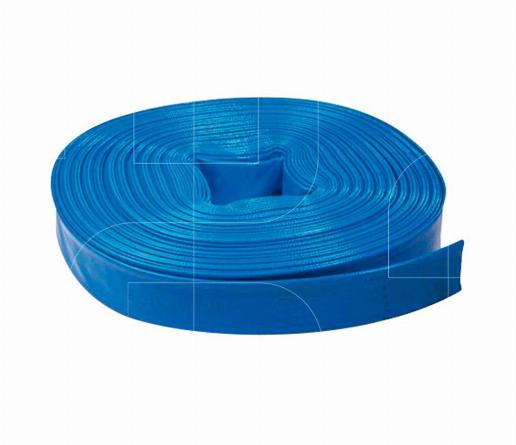 Plat afrolbare afvoerslang 2" en geplastificeerde PVC slang verstevigd met polyesterdraad met een lengte van 25 meter.