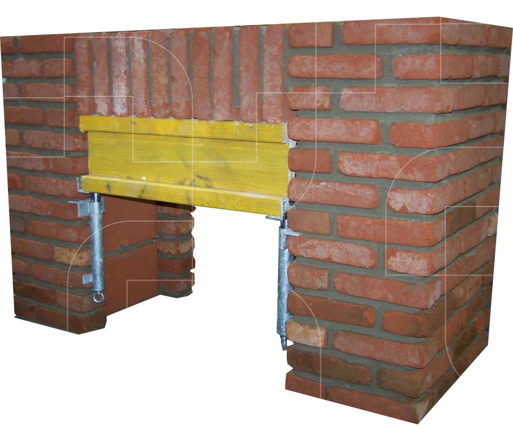 De linteelschoor wordt bevestigd in de voegen van het metselwerk, deze wordt gebruikt voor de ondersteuning van het voorlopig draagprofiel.