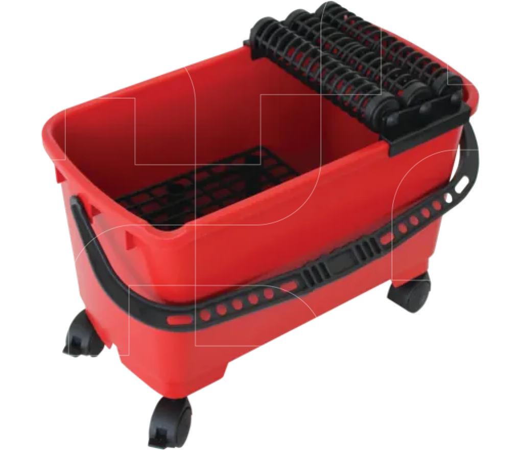 - Uitgerust met 2 gegroefde uitwringrollers om het water goed te kunnen afvoeren en om zo de sponzen een optimaal vochtgehalte te geven
