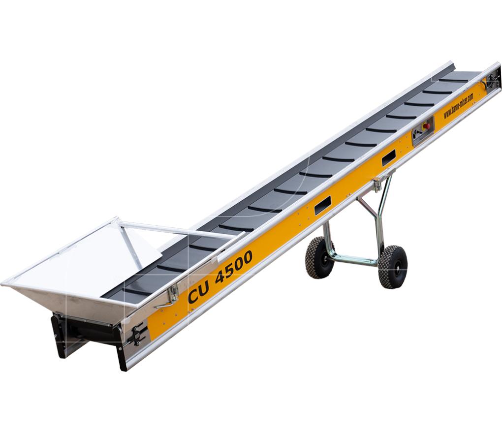 De transportband is afgebeeld met de invoerbak en het onderstel, die apart moeten worden aangeschaft.