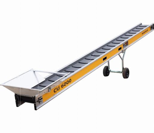 De transportband is afgebeeld met de invoerbak en het onderstel, die apart moeten worden aangeschaft.