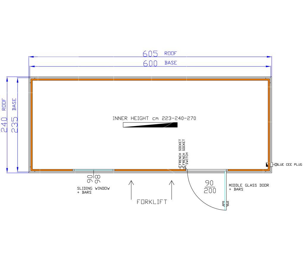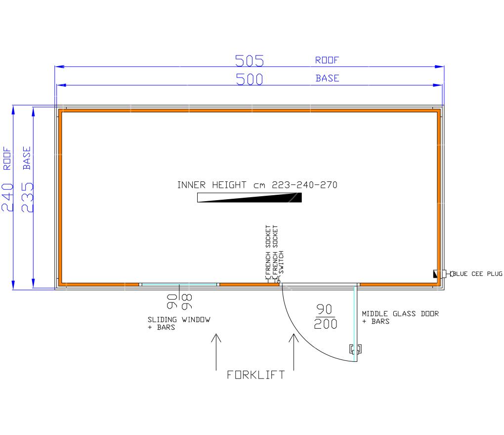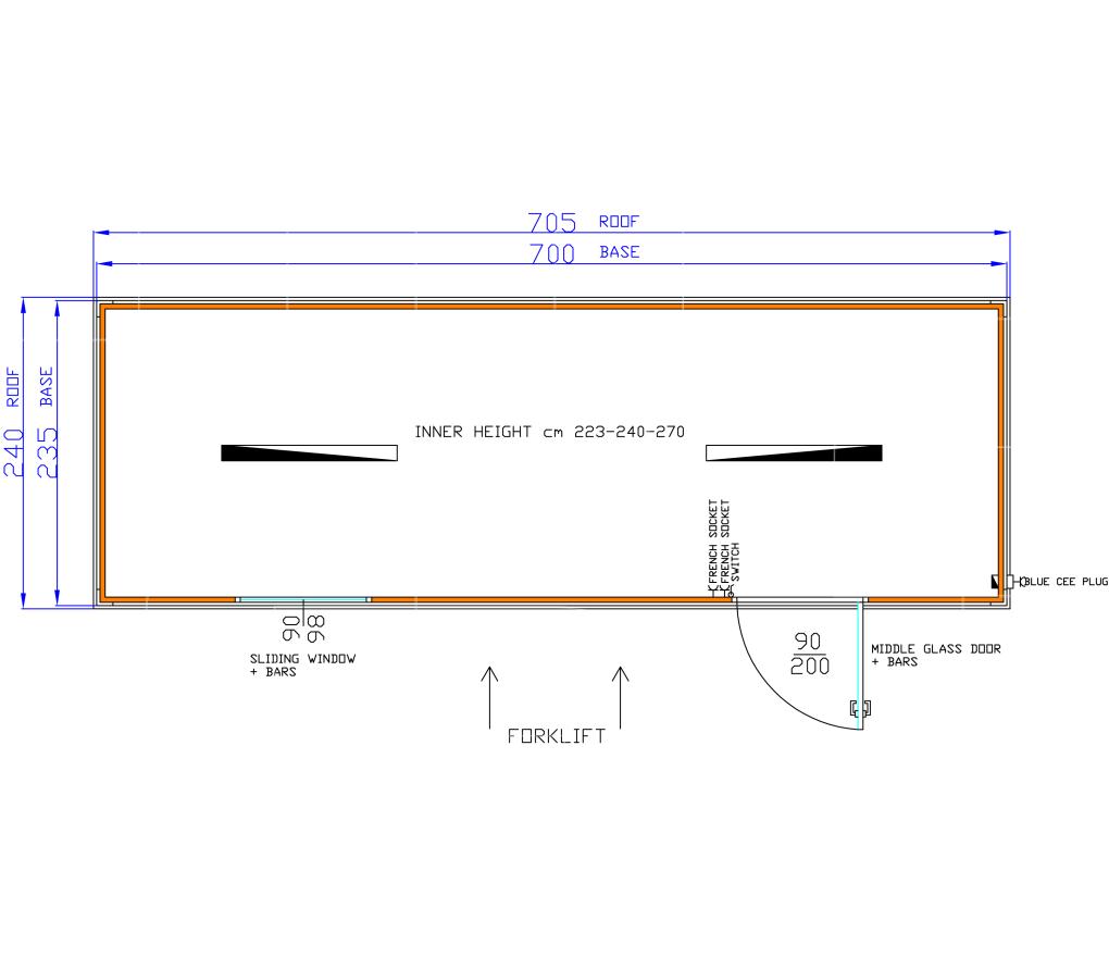 Standaarduitrusting omvat: geïsoleerde container, deur met raam 97x205 cm, schuifraam 97x105 cm, verlichting, elektriciteit met standaard twee stopcontacten, vorkliftvoorziening onderaan de containers, vier hijsogen aan de bovenkant en CE-stekker aan de buitenkant.