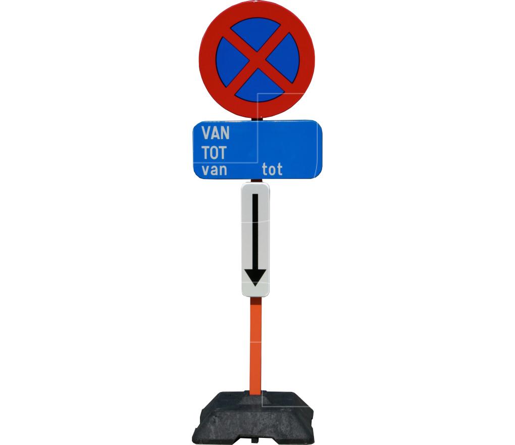 Verkeersbord E3 - verboden stil te staan en parkeren op statief en blauw onderbord 400x200 mm.