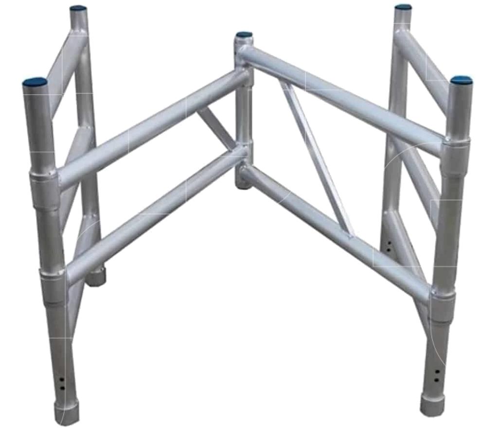 De vouwunit dient als verhoogstuk bij de opbouw van de vouwsteiger of kan in combinatie met een platform ook afzonderlijk gebruikt worden als rollend werkplatform van 1 meter hoogte.