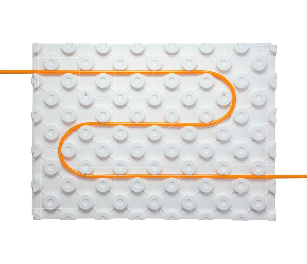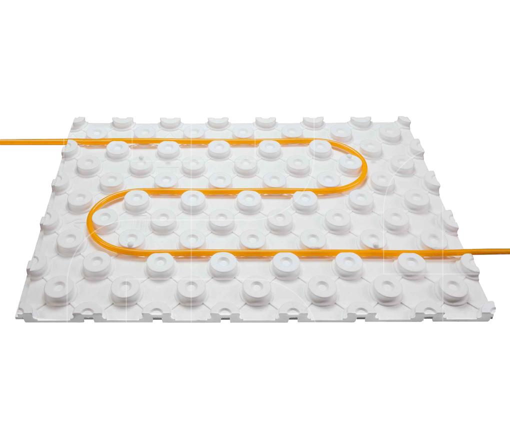- De verwarmingsbuizen worden op de plaat bevestigd door ze naargelang de gewenste tussenafstand in een raster van 75 mm tussen de tapse noppen te klemmen