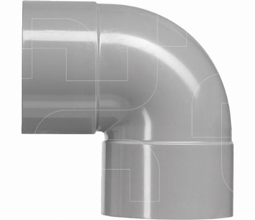 Een PVC sanitair bochtstuk met een hoek van 90°, grijs van kleur, voorzien van een mof/spie of mof/mof-verbinding, wordt vaak gebruikt in sanitaire installaties voor het maken van bochten in leidingen.