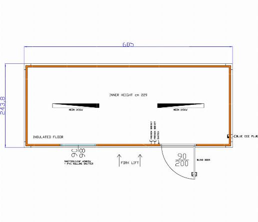 Standaard uitgerust met een deur (aluminium) en draai-kiepramen met rolluiken. Eveneens voorzien van vorkheftruckuitsparingen, elektriciteit en verlichting.