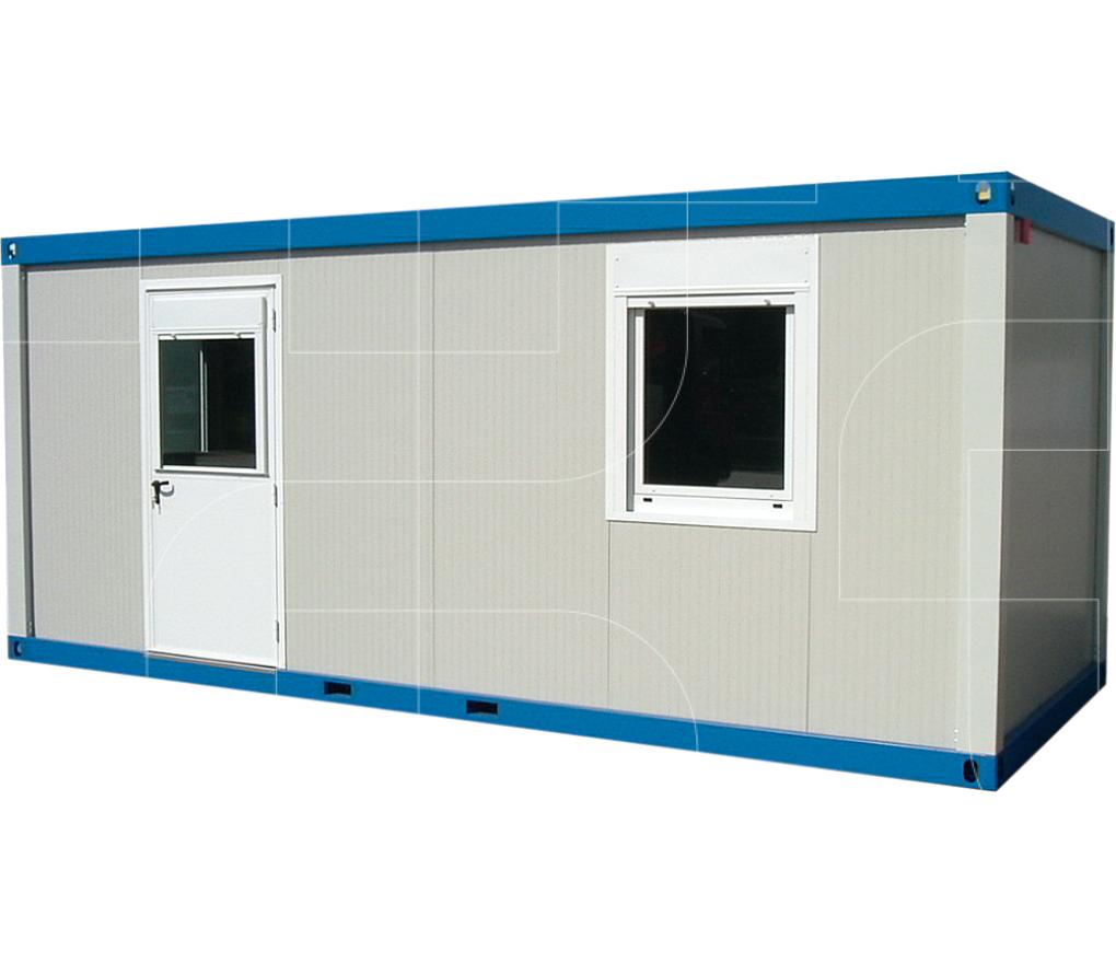 Standaard uitgerust met een deur (aluminium) en draai-kiepramen met rolluiken. Eveneens voorzien van vorkheftruckuitsparingen, elektriciteit en verlichting.