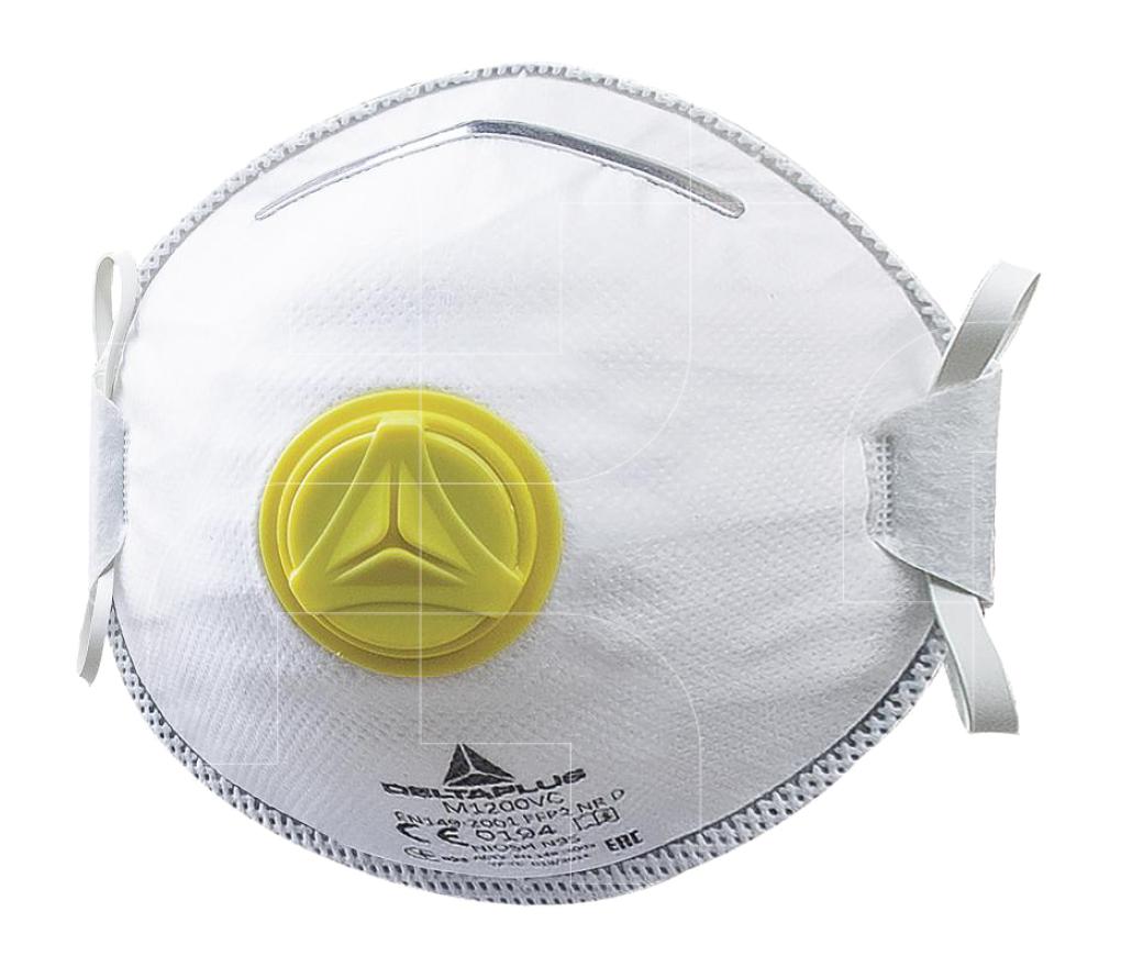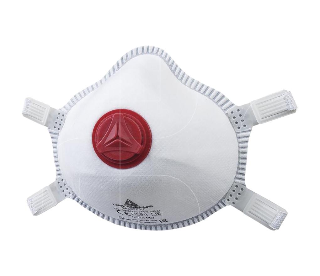 Masker FFP2 met uitademventiel dat bescherming biedt tegen nevels van middelmatig giftige vaste stoffen en vloeistoffen.