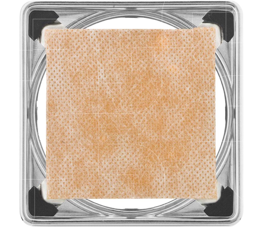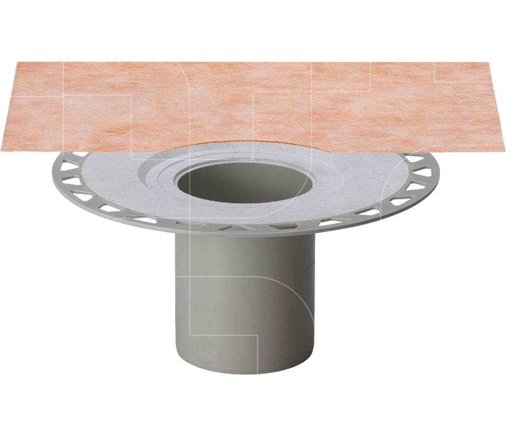 Op de brede trapeziumvormig geperforeerde en met een vlies beklede kleeflens van het dunbed-opzetstuk wordt de KERDI- manchet als dichte aansluiting op de hechtende oppervlakteafdichting verlijmd.