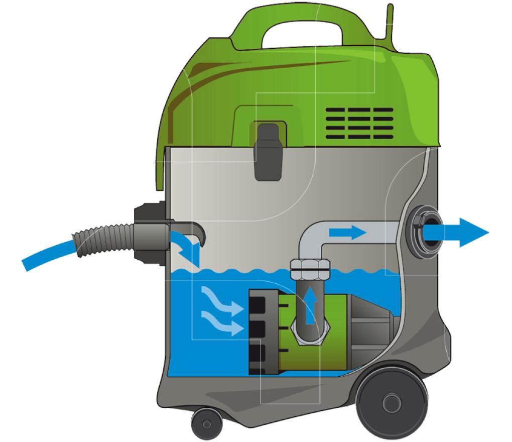 - Krachtige waterpomp direct geïmplementeerd in het vacuüm gedeelte van de stofwaterzuiger