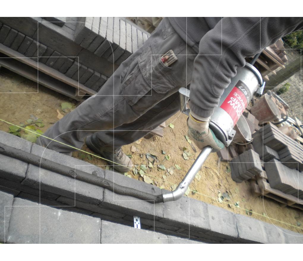 Lijm- en mortelpomp voor het handig verlijmen van gevelsteen, snelbouwsteen, cellenbeton, als alternatief op de traditionele spuitzakken.