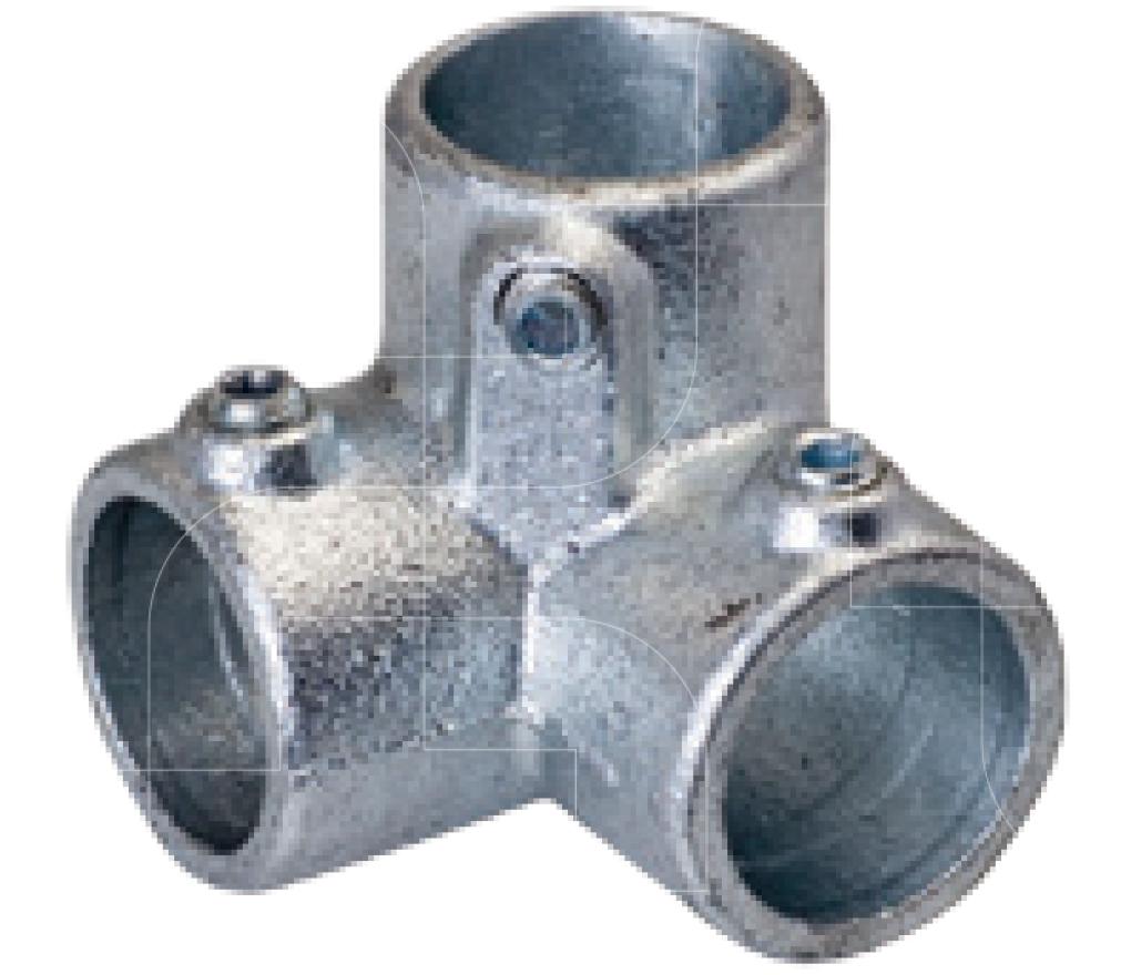 De buiskoppeling drieweg elleboog Ø 48,3 mm creëert een 90° hoekverbinding voor drie buizen die samenkomen in één punt.