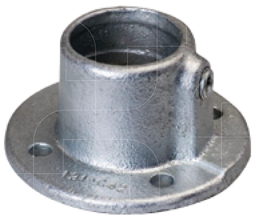 Deze voetplaat met een ronde flens en vier bevestigingsgaten is geschikt voor het bevestigen van constructies en wordt vaak gebruikt als voet- of muurbevestiging.
