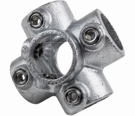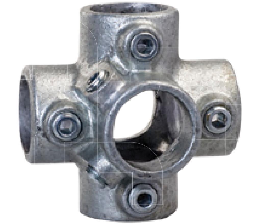 Buiskoppeling Vierweg 90° koppelstuk met diameter van 48,3 mm verbindt één verticale buis met vier horizontale buizen in vijf richtingen.