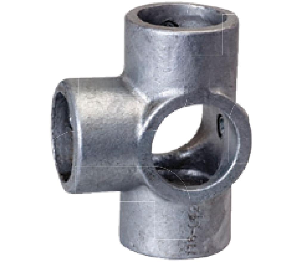 Een buiskoppeling T-stuk met zij-uitgang Ø 48,3 mm verbindt één verticale buis met drie horizontale buizen in vier verschillende richtingen.