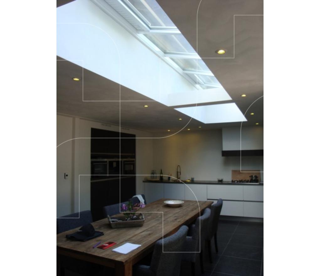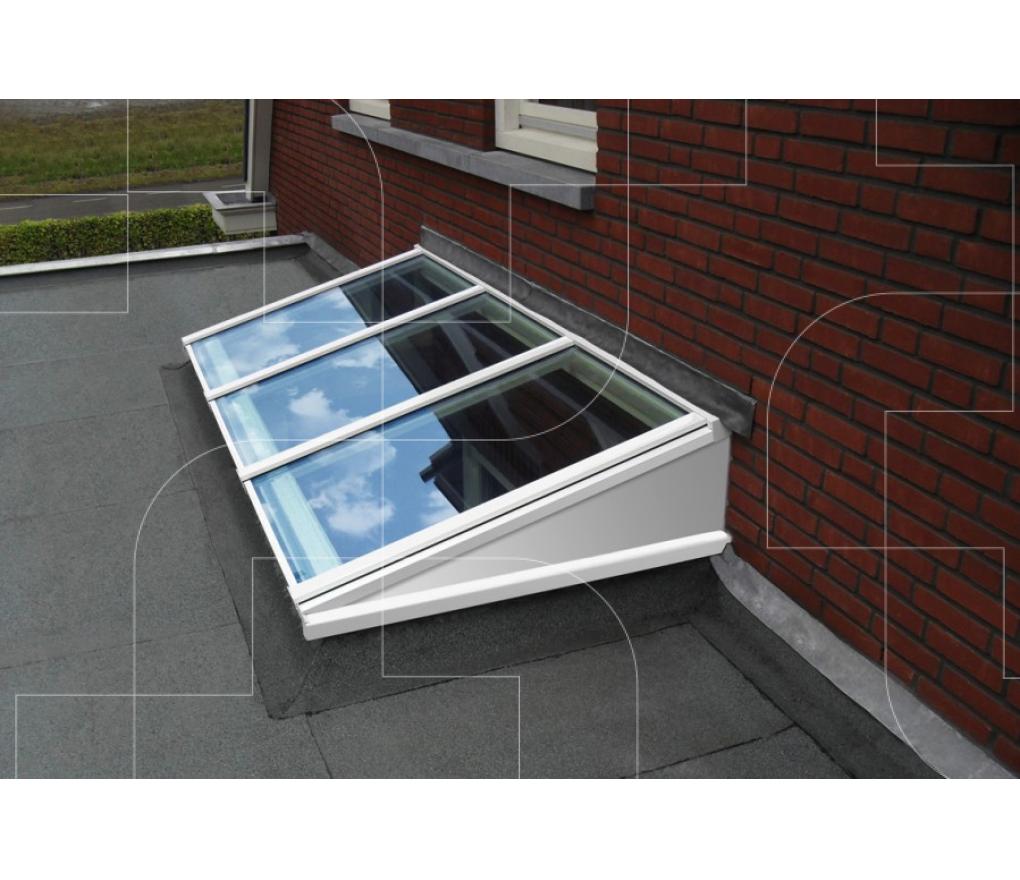 - Dit type lichtstraat wordt vaak toegepast in een aanbouw van de woning. Door de lichtstraat tegen de opgaande bestaande buitenmuur te plaatsen, wordt de oude daglichtinval maximaal hersteld. Hierdoor komt het daglicht vergelijkbaar zoals voorheen de woning in. De hellingshoek is 15°.