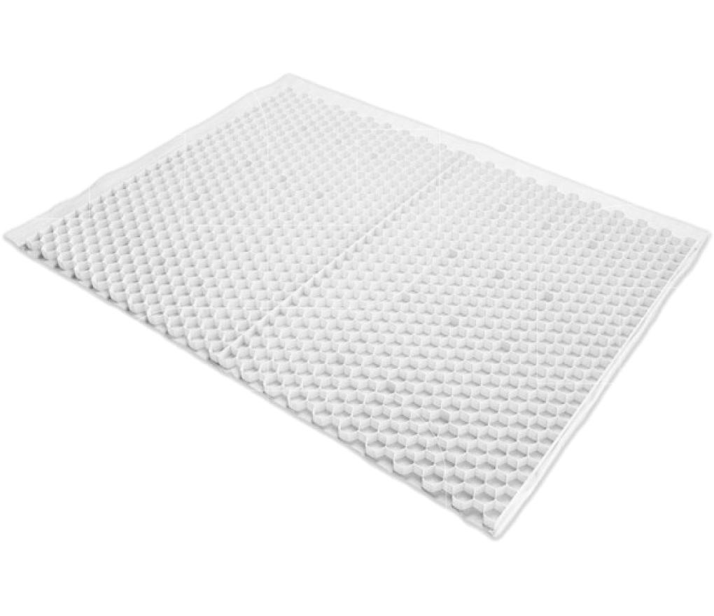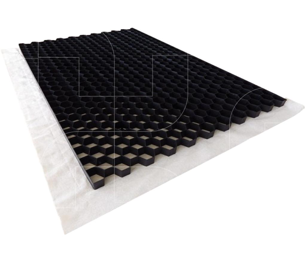 De platen met honingraatstructuur die worden gebruikt voor grindstabilisatie. De mazen met een diameter van 49 mm worden aan de onderzijde voorzien van een poreus geotextiel (thermisch gelijmd).