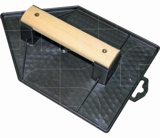Schuurbord polystyreen zwart met houten handgreep en puntige vorm voor het afwerken en gladstrijken van pleister- en stucwerk.