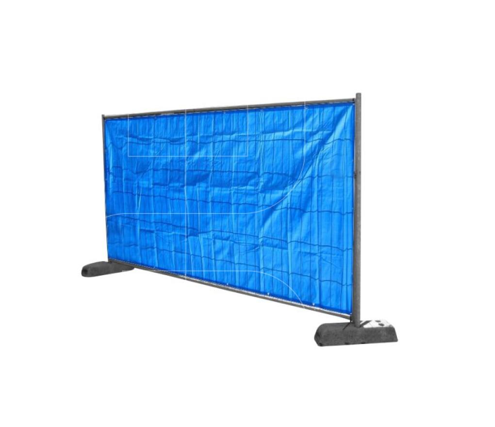 Winddoorlatende bouwhekzeilen, ontwikkeld voor bevestiging aan mobiele bouwhekken van 3,5x2 meter.