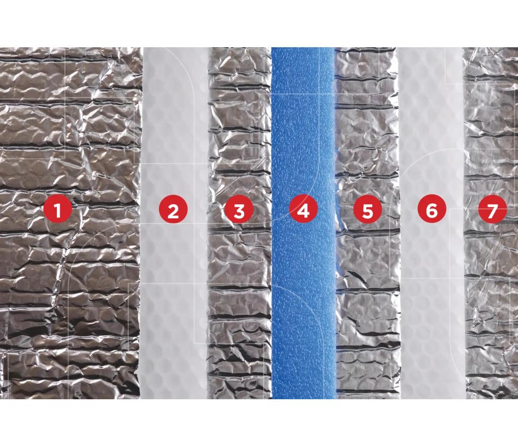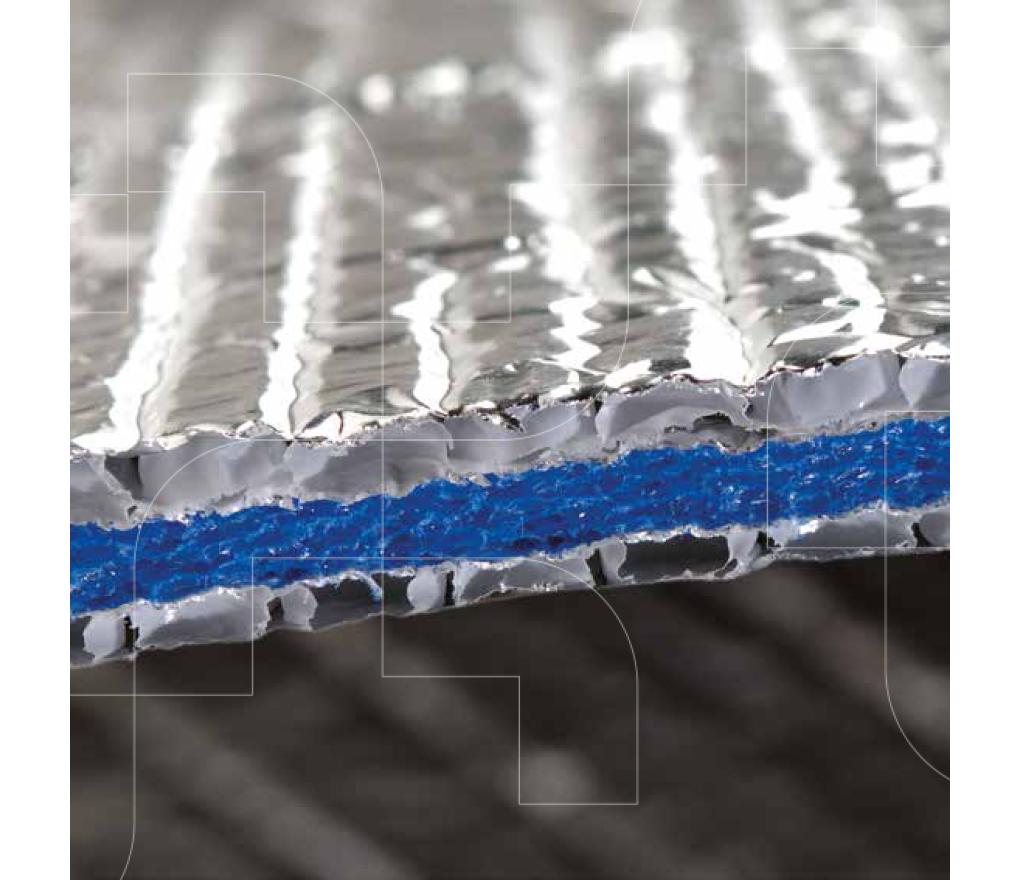 Bestaat uit twee lagen zuiver, gepolijst en tegen oxidatie behandeld aluminium van 30 micron. Deze aluminiumlagen worden gescheiden door twee lagen luchtbelletjes in honingraatmotief die omgeven zijn door een brandwerende polyethyleenfilm en twee extra lagen zuiver aluminium, plus brandwerend en vochtafstotend polyethyleenschuim.