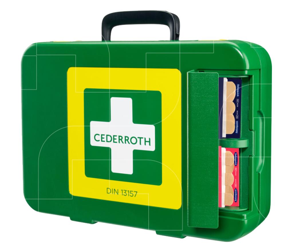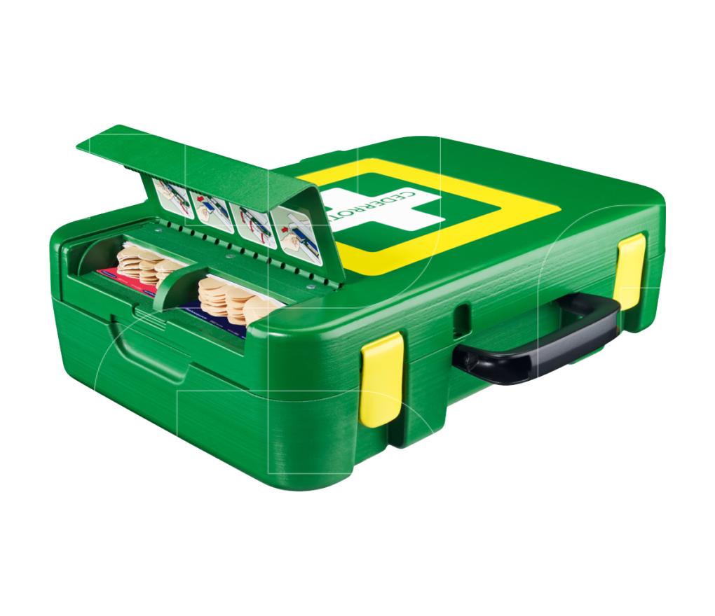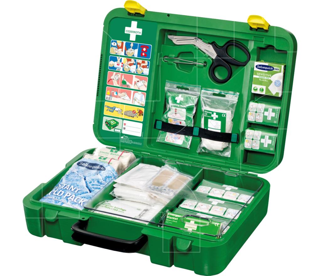 Cederroth First Aid Kit X-Large is een royale en goed uitgeruste eerstehulpkoffer gemaakt van hardplastic om stof, vocht en vuil buiten te houden, ook in een moeilijke omgeving. De pleisterautomaat op de buitenkant maakt het eenvoudig er een pleister uit te nemen, terwijl de inhoud in de koffer niet wordt aangeraakt en hygiënisch schoon blijft. In de koffer liggen de producten overzichtelijk ingedeeld in vakken en het is gemakkelijk om het juiste product te vinden wanneer iedere seconde telt. In het deksel vindt u onder andere handschoenen, beademingsmasker, schaar en pincet. Alle producten zijn voorzien van duidelijke zelf verklarende instructies. Slimme rode bijvulstickers in de koffer geven aan wanneer het tijd is om een product bij te vullen. De koffer kan ook aan de wand worden bevestigd en worden losgetrokken als meeneemkoffer.
