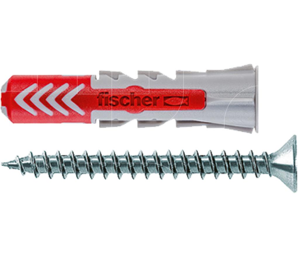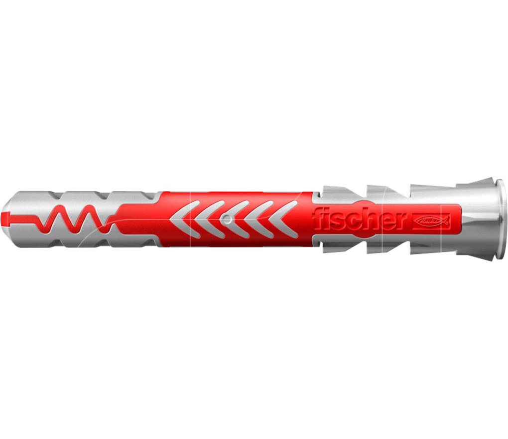 Fischer DuoPower heeft een zeer hoge bevestigingswaarde door de 2 componenten: De grijze component van kwalitatief hoogwaardig nylon activeert, afhankelijk van het bouwmateriaal, automatische het optimale werkingsprincipe (spreiden, tikken, knopen) voor het optimaal houvast. De expansievleugels van de rode component ondersteunen de betrouwbare spreiding en biedt extra veiligheid voor de grijze component. De schroef gewoon indraaien en tot slot goed „aantrekken“. De schroef niet de vast aandraaien. De bij de kop aangebrachte rand voorkomt, dat de plug in het boorgat glijdt.
