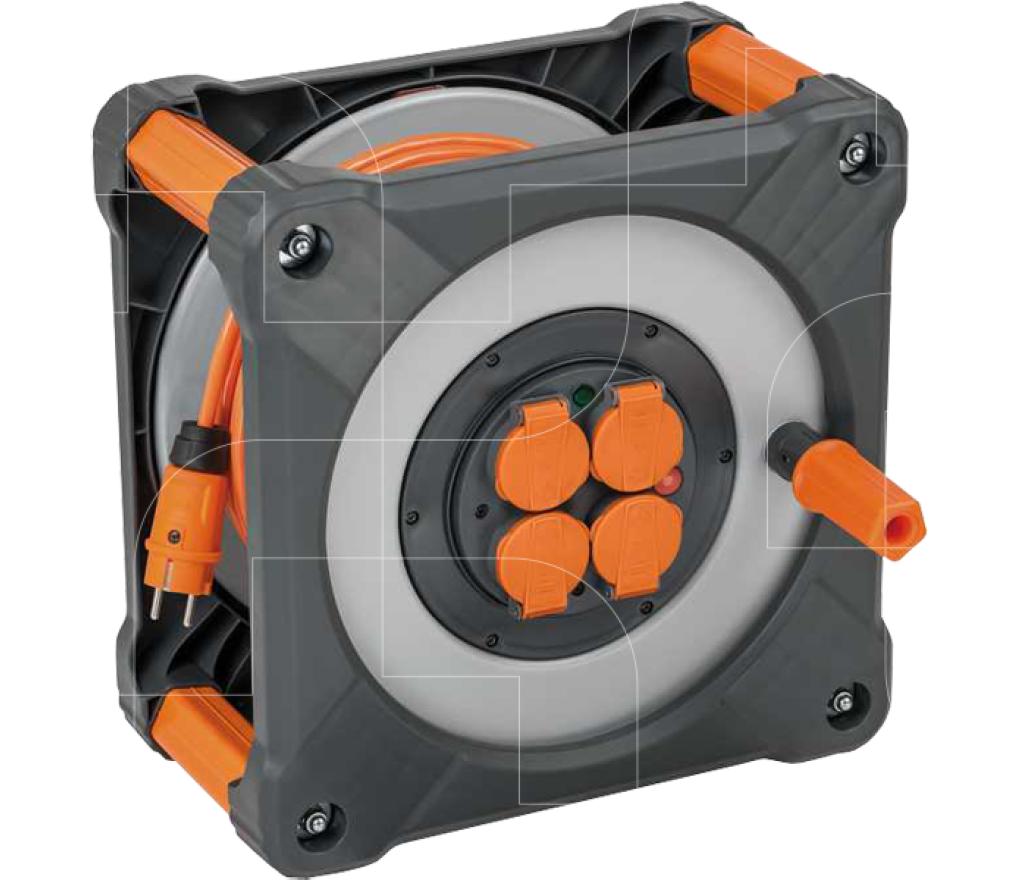 - Schok- en stootbestendige behuizing en haspel uit Rubbabren-materiaal, een mengeling van kunststof en rubber, voor langdurig gebruik in zware werkomstandigheden