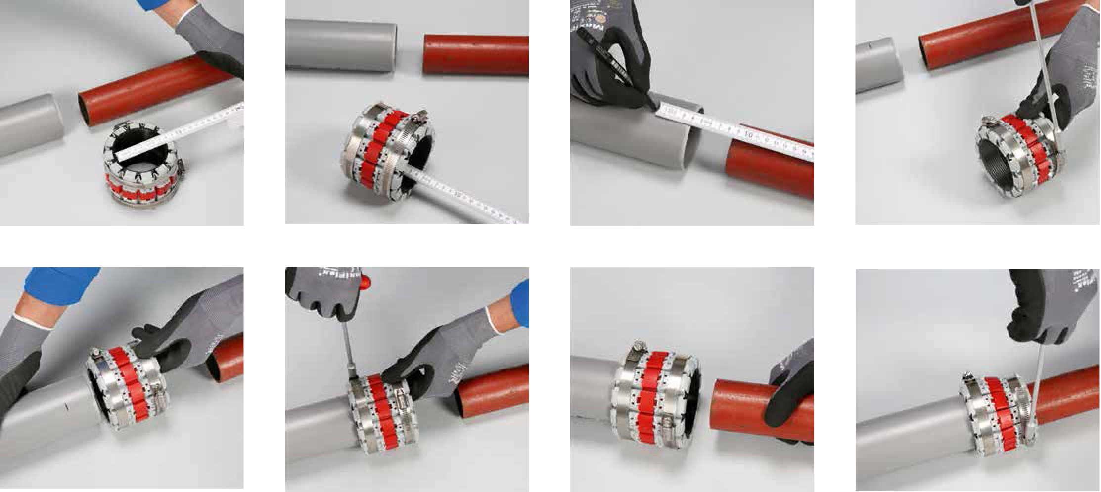 De FHS-koppeling kan horizontaal of verticaal worden ingebouwd en kan zowel ondergronds, als onder stucwerk gebruikt worden. Buizen uit alle gangbare materialen, zoals gietijzer, staal, PP, PE, PVC, gres en andere gladde of gegolfde buizen kunnen worden verbonden met een diameter van DN/OD 40 tot DN/OD 110.