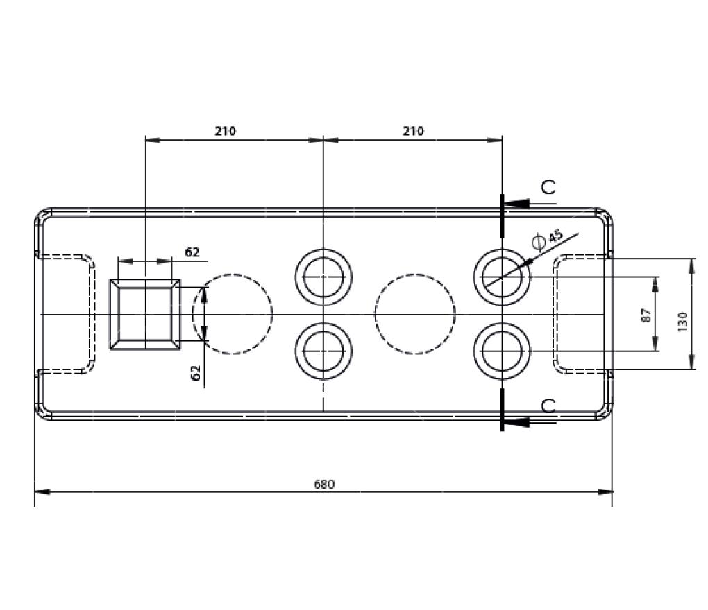 - 4 ronde gaten + 1 vierkant gat