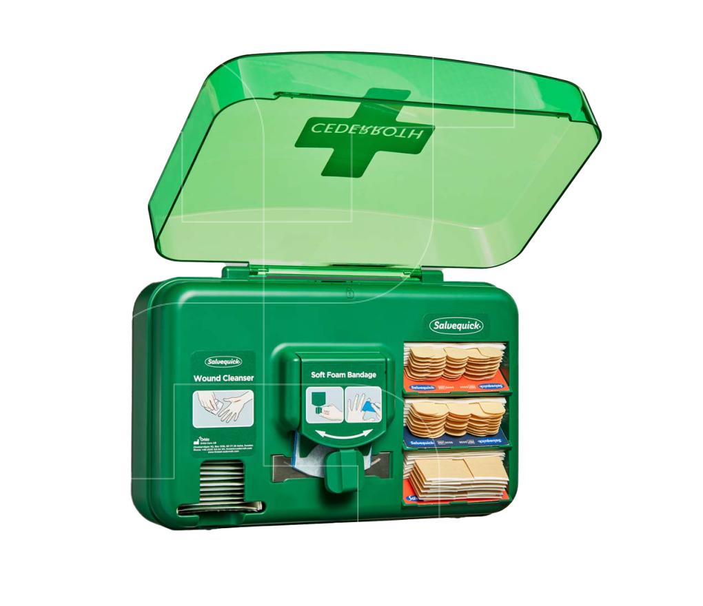 Cederroth Dispenser voor wondverzorging bevat een verscheidenheid aan producten voor gebruik bij kleine wondjes. Alle producten zijn gemakkelijk verkrijgbaar en beschermd tegen stof en vocht door het groene transparante deksel. Er wordt een speciale sleutel meegeleverd voor het vervangen van de vulling. De dispenser bevat wonddoekjes en een groot aantal pleisters in verschillende maten en ook Soft Foam Bandage Blue, een zelfklevende pleister zonder lijm die zelfs in water blijft zitten.