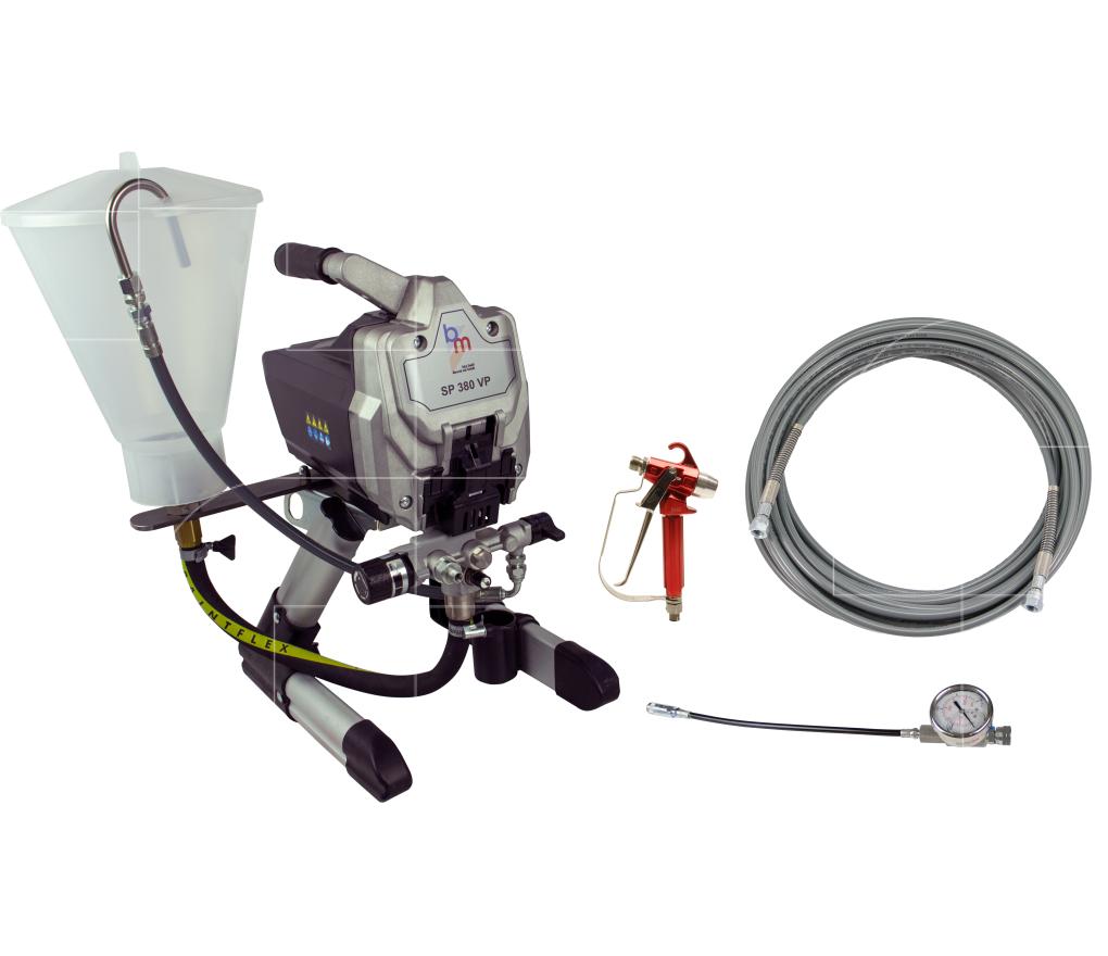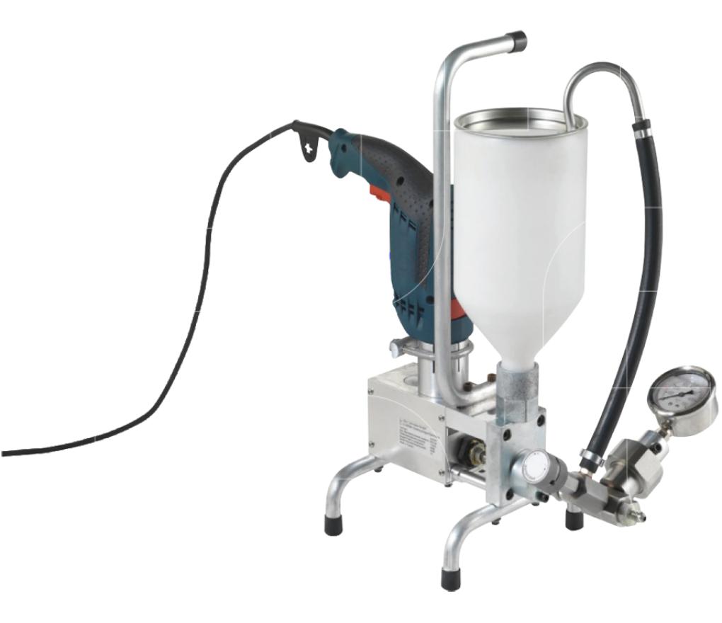 Elektrisch aangedreven airless zuigerpomp voor injecteringswerken. Geleverd in een complete set met 7.5m slang, injectiepistool en injectieset met manometer.