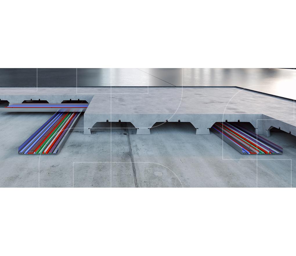 - Maakt een snelle en intuïtieve installatie mogelijk . De basismodules creëren een orthogonaal raster dat de positionering van MEP met grote precisie en flexibiliteit ondersteunt. Beton wordt vervolgens over de bovenste bekisting gegoten, waardoor een monolithische beloopbare basis ontstaat
