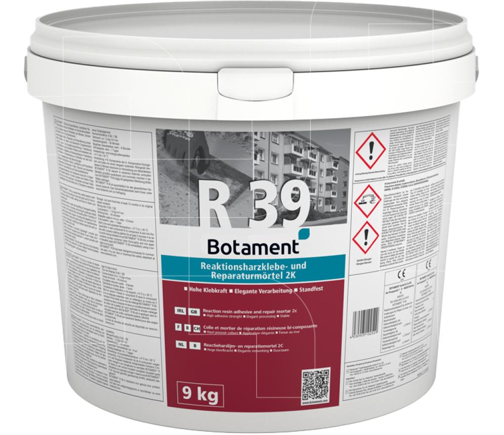 R39 ist een oplosmiddelvrije, standvaste reactieharsmortel voor de verlijming van bouwdelen en herstelling van beschadigde zones op muren, plafonds en vloeren binnen en buiten.
