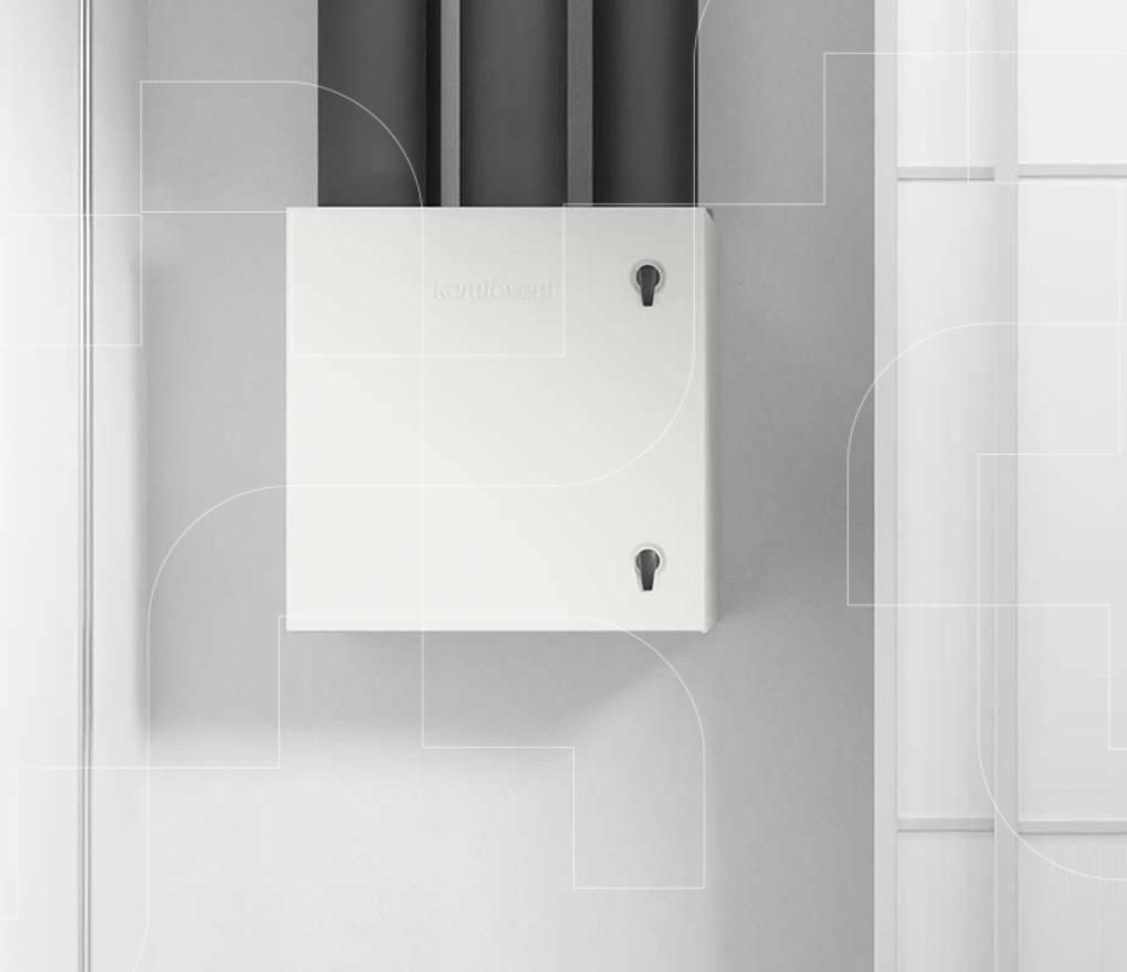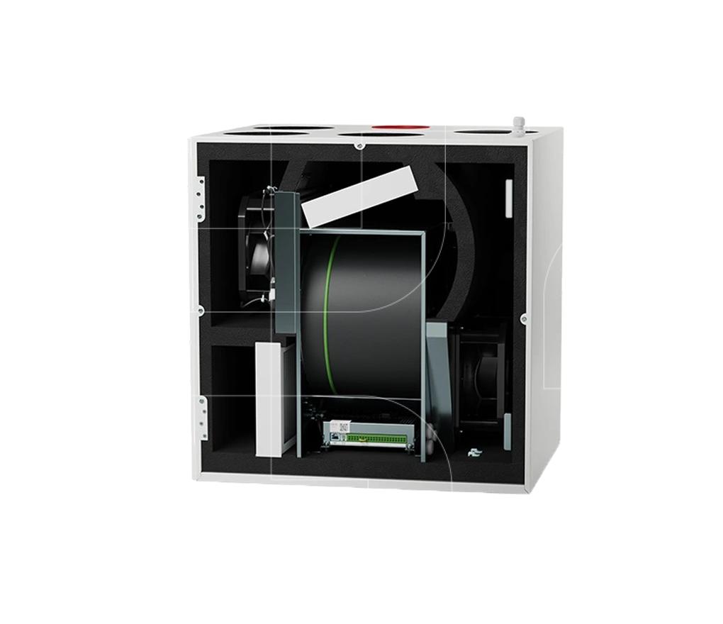 Compacte ventilatie-unit met bovenaansluitingen (bovenaansluiting) in industriële bouwkwaliteit en voorzien van een warmtewiel. Uitgerust met een professionele C8 sturing en hoge kwaliteit sensoren en motoren. Debiet: 266 m³/h bij 200 Pa