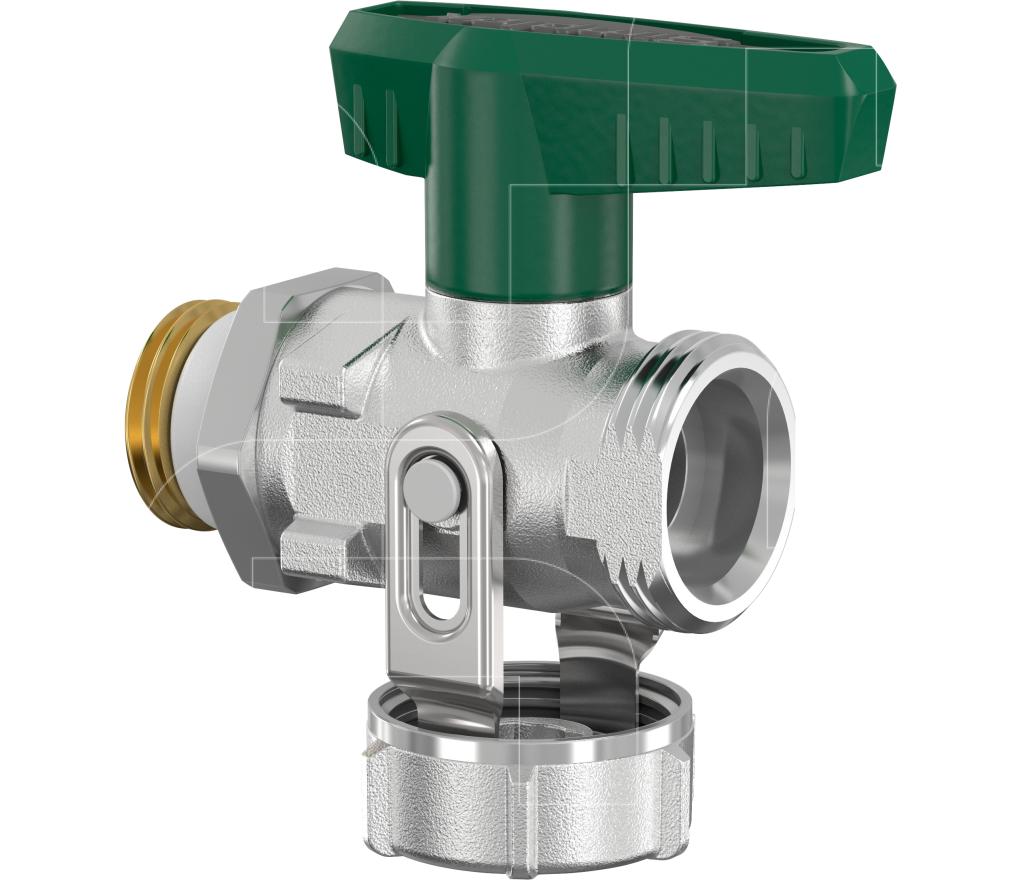 Kogelkraan met goedkeuring voor drinkwatersystemen en warmwater-verwarmingsinstallaties met groene hendelgreep en buitendraad, zelfdichtend met speciale schroefdraadafdichting, zonder slangaansluiting.